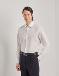Regular-fit fil-a-fil cotton formal shirt combining traditional elegance with contemporary comfort. The semi-spread collar and clean design without placket express essential sophistication, while the fine thread of the fabric ensures softness, durability and a pleasantly smooth touch. Mother-of-pearl buttons complete this garment designed for the man who seeks style and functionality in every detail. FABRICS AND CRAFTSMANSHIP - Formal shirt - Semi-spread collar - Collar height 4.2 cm - Smooth front with no placket - Removable ribs - Smooth back with no pleats - Semi-rounded cuff - Mother of pearl buttons - 100% Cotton - Made in Italy CARE Machine wash max 30° Do not bleach Normal steam or dry iron on low (110°) Do not dry clean Do not tumble dry FIT Regular fit The model is wearing a size 50 The model measures: Height: 185 cm (72.8 in) Chest: 100 cm (39.4 in) Waist: 79 cm (31.1 in) Hips: 95 cm (37.4 in)