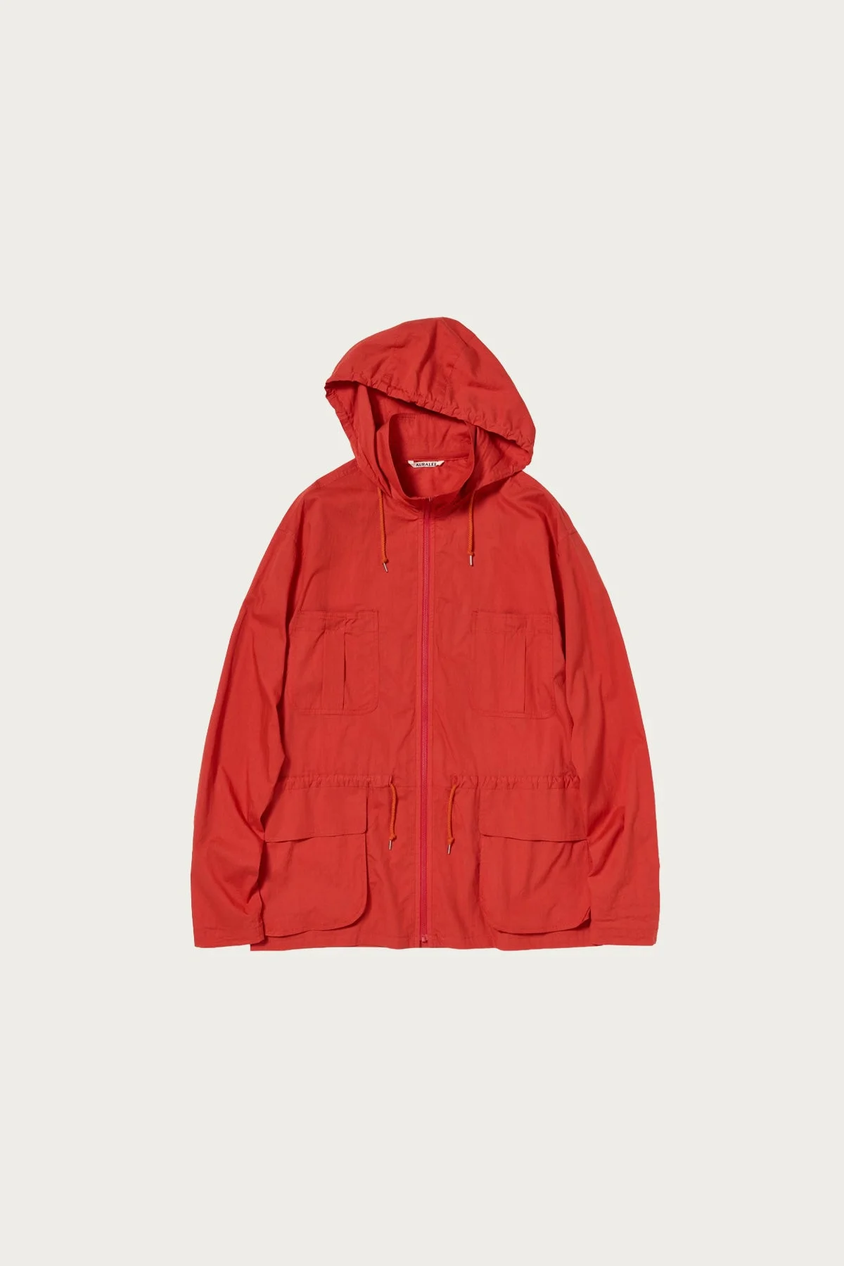 A lightweight hooded blouson from Auralee, cut from an ultra-fine cotton lawn that feels almost weightless on the body. Made using organically grown American Pima cotton, the fabric carries a subtle sheerness with a smooth, airy hand that moves easily with wear. The silhouette is relaxed and easy, with a zip front, drawcord hood and waist, and a softly structured body. Patch pockets at the chest and larger flap pockets at the waist bring a functional balance to the otherwise refined material. An ideal layer for warmer days, worn over a tee or tank, paired with loose trousers or shorts. The kind of piece that adds color and lightness without ever feeling heavy.
