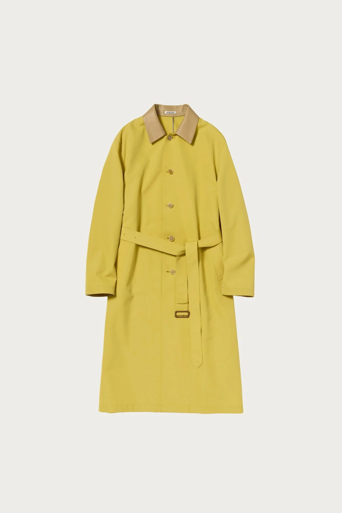 A long belted coat in dense wool max canvas with a smooth, structured drape. The mustard yellow tone is bold but softened by the matte finish of the fabric. Finished with a clean collar, button front, and self belt to adjust the silhouette. Layer it over tonal knits and trousers to let the color stand out. Also strong thrown over simple black for contrast. - Relaxed fit - Below knee length - Unlined - Single vent - Mustard Yellow