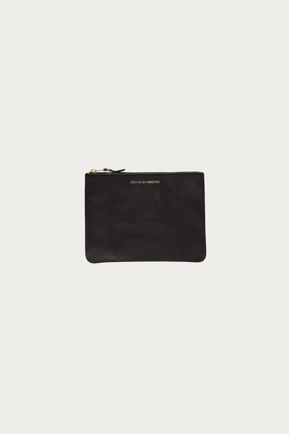 Soft, washed cowhide leather gives this slim zip pouch a relaxed feel with a lived in texture. Simple, functional, and perfect for daily carry. The gold foil logo and hardware add a clean contrast to the matte finish. Sized for cards, cash, and small essentials without bulk. - One compartment - Zip closure - Gold foil embossed logo - 145mm x 105mm - 100% Calf leather - Made in Spain - Black