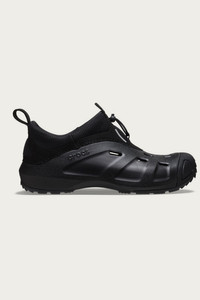 The Quick Trail Low is our design team's freshly inspired riff off the outdoor water shoe from 2010. It utilizes both molded Croslite™ and a technical textile upper so you get the best of both worlds. The simple branding helps elevate the shoe, and adding new details like reflective prints bring the shoe into the modern outdoor space where fashion and practicality intertwine. - Synthetic upper - Mesh lining - Padded collar - Crocs branding at tongue - Crocs logo branding at lateral sides - Cut-out detailing - Reflective details at tongue - Drawstring-adjustable lace closure - Heel and tongue pulls - Rubber outsole - Black
