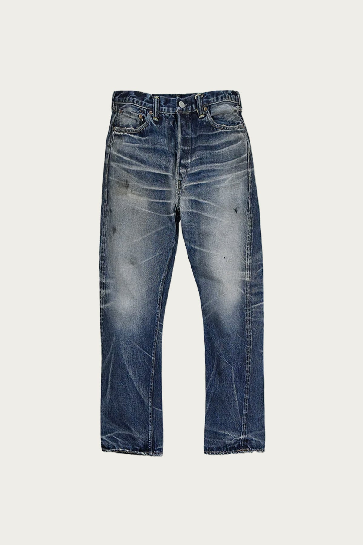 Fullcount takes their signature denim and pushes it into the realm of modern art with the Fear of Dark finish. Built on the iconic 0105XX base, this pair starts with a heavyweight, long staple Zimbabwe cotton denim that already has serious texture and drape. The wash adds a ghostly, almost spotlighted contrast with whiskers, thigh streaks, and the hand-done wear patterns that Fullcount is known for. They feel lived in but never artificial, broken in with the kind of personality you normally only get from years of wear. The fit sits easy through the top with a gentle taper through the leg. Soft hand, roomy comfort, and a natural broken-in swing make these a joy to pull on. A pair for collectors and everyday wearers alike. - 13.7oz Zimbabwe cotton denim - 0105XX wide straight silhouette - Fear of Dark special wash treatment - Deep whiskering and vertical fading - Vintage inspired patch and hardware - Button fly