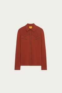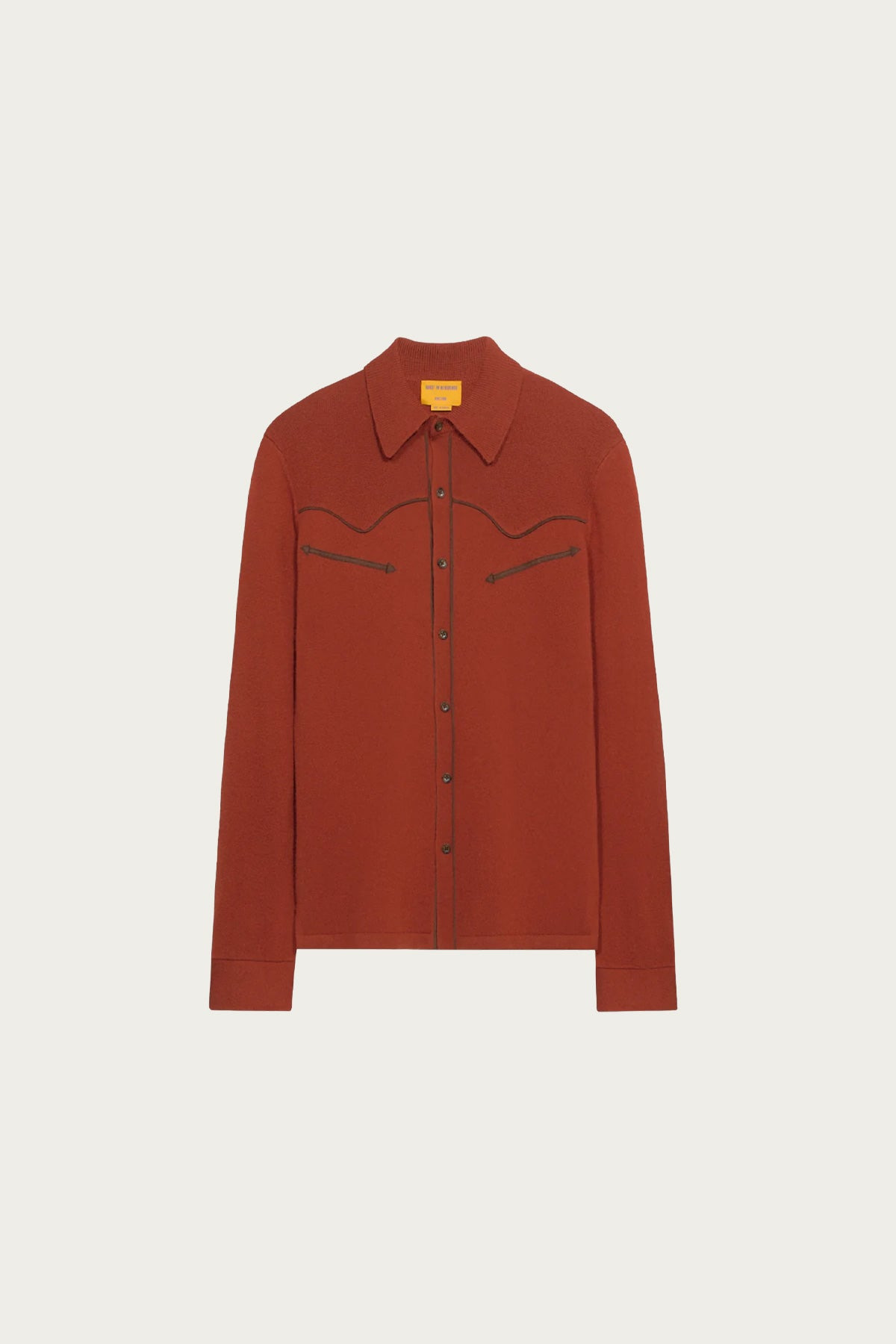 Cut from light-weight cashmere, this button-up shirt features a Western-inspired yoke, with faux pockets and piping in vegan suede. It's further embellished with a tubular hem, bucket sleeve cuff and branding on the back. - Unisex cashmere button-up shirt - Light-weight knit - Western-inspired yoke accented with vegan suede piping - Western style faux pockets in vegan suede - Button sleeve cuff with placket - Jersey tubular hem - Signature gir branding at center back - 12 Gauge - 100% cashmere - Cinnamon