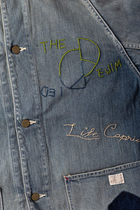 Kapital reimagines the humble work jacket with its hand-drawn, memorial-style embroidery scattered across a rugged 12oz indigo denim body. Each piece feels personal and archival, with classic workwear details like triple-needle stitching, utility pockets, and a boxy fit that lends itself to layering. Throw it on with wide-leg denim or fatigue pants to build a Kapital-heavy silhouette. - 12oz washed indigo denim - Memorial embroidery across chest and sleeves - Classic coverall silhouette with button front and utility pockets - Slightly cropped, boxy fit - Made in Japan