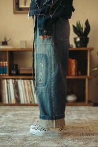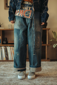 Kapital reimagines classic military wear through a distinctly DIY lens with the RUSHFIELD Remake Fatigue Baggy Pants. Built from sturdy 14oz denim, this pair takes the shape and utility of traditional fatigue trousers and infuses them with raw, lived-in energy. Hand-finished distressing, patchwork, and reinforced paneling transform each pair into a one-of-a-kind artifact—part vintage, part experimental, all Kapital. The exaggerated baggy fit provides a relaxed silhouette that pairs perfectly with cropped jackets and oversized tees. Signature details like the slanted patch pockets and drawstring waist root the piece in its utilitarian past, while the RUSHFIELD finish offers a future-forward sense of individuality. - 100% cotton 14oz denim - Fatigue-style front patch pockets - Unique RUSHFIELD Remake distressing and mending - Baggy, full-leg fit with drawcord waist - Reinforced panel construction - Made in Japan