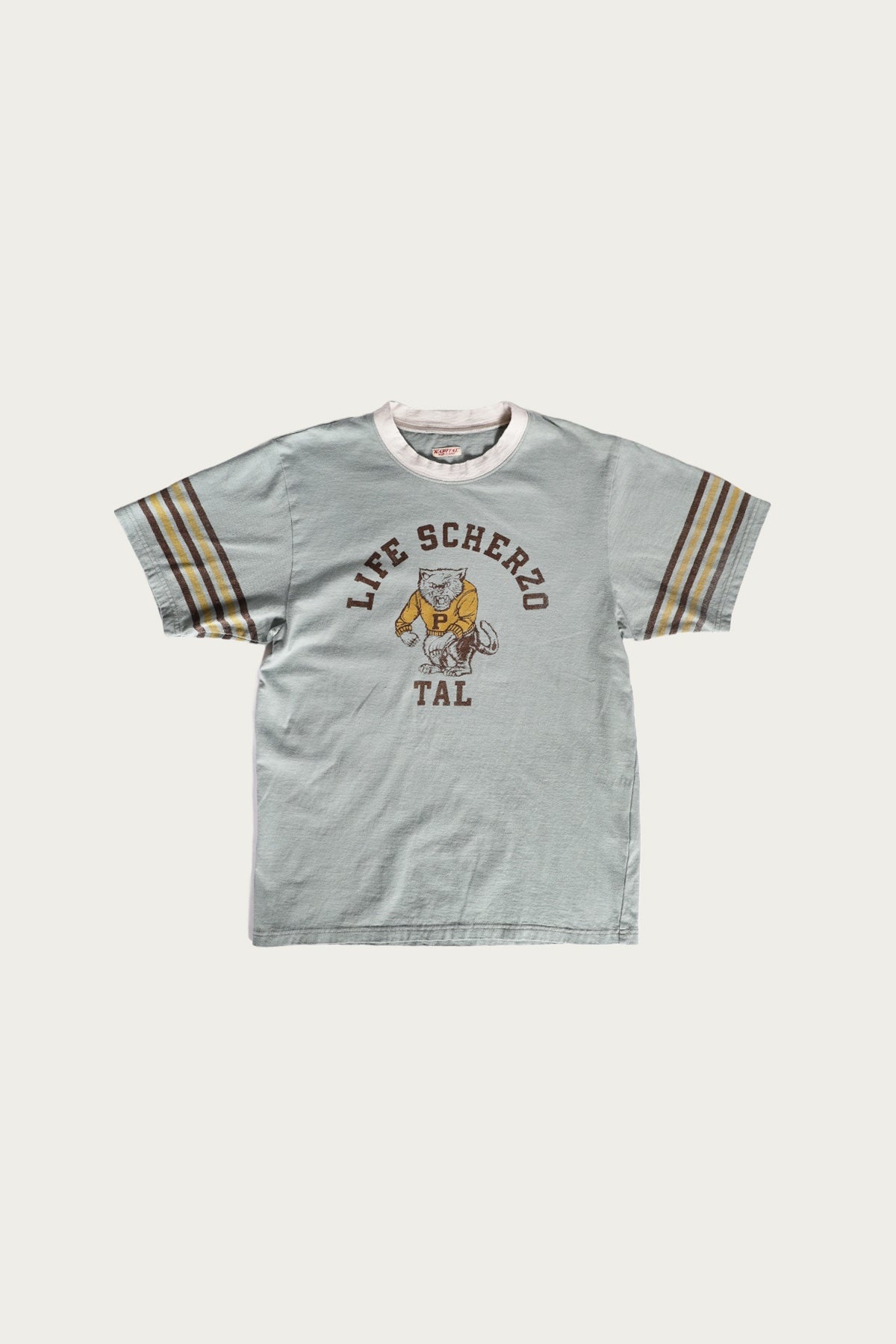A jersey ringer T-shirt with a college-inspired print of a cat motif on both the front and back. The back design showcases inverted lettering and an image of a cat's back.