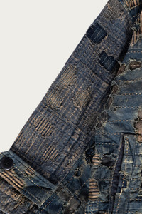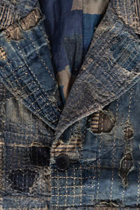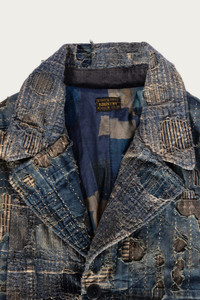 This KAPITAL coat is crafted in Japan with paneled denim for a relaxed, mid-length fit. The unique boro patchwork pattern adds a touch of individuality, while the classic notched lapel and front button closure provide a polished look. Perfect for adding a statement piece to any wardrobe.
