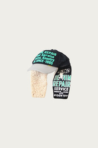 Kapital’s KOUNTRY line takes the classic trucker cap and turns it into something playful and full of character. This cap is printed with bold repair shop graphics that feel pulled from small-town Americana. The removable fleece ear flaps snap down when temps drop. It’s a cap with real personality that fits right into Kapital’s world of lived-in charm. - Poly mesh trucker construction - Printed KOUNTRY graphics - Removable fleece ear flaps with snaps - Adjustable back strap - Made in Japan - Black/Grey