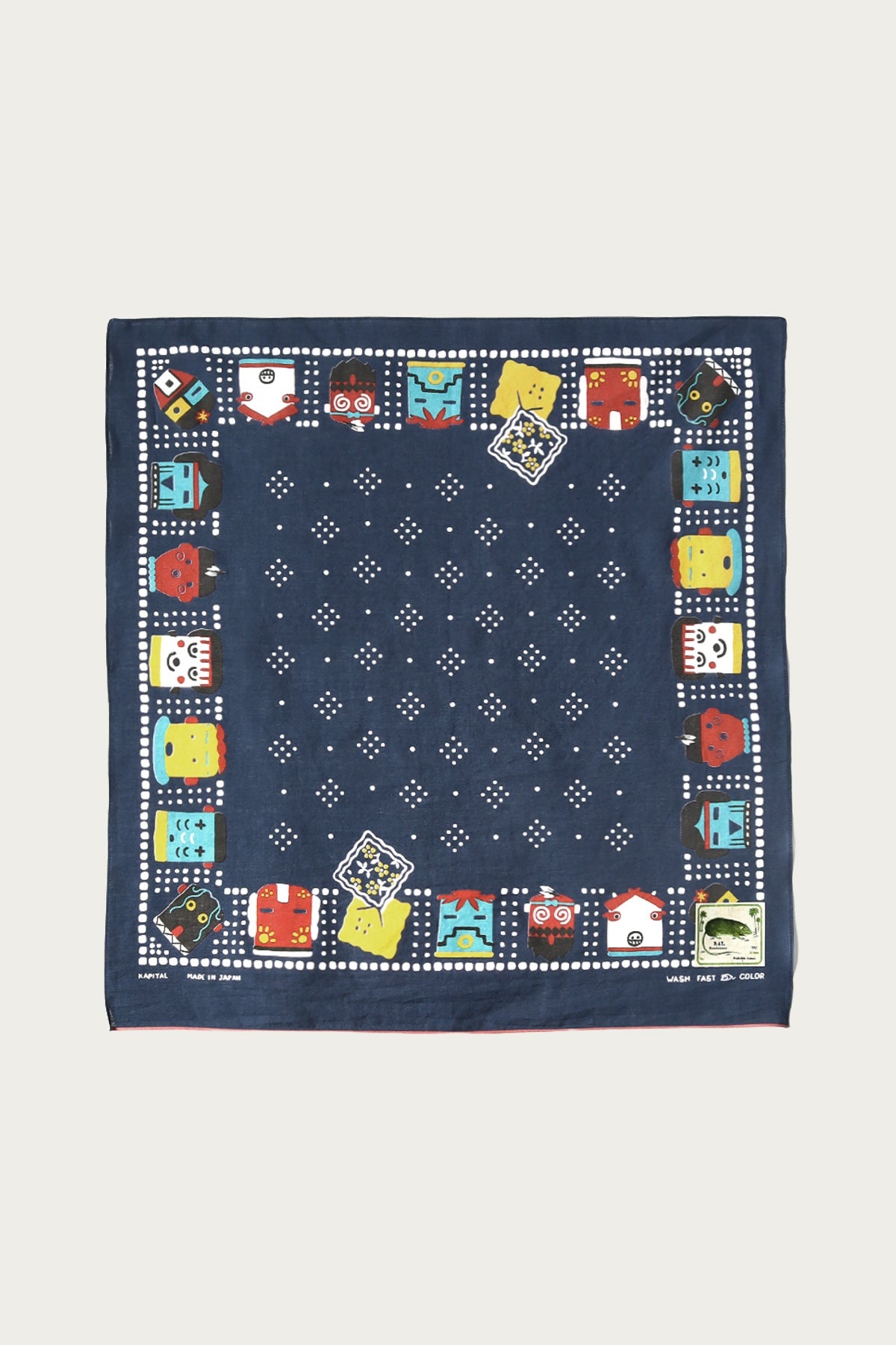Each bandana features a border of stylized Kachina figures rendered in Kapital's signature playful aesthetic. The central field showcases a traditional dotted pattern, adding depth and balance to the design. Crafted from 100% cotton, these bandanas are produced using traditional discharge dyeing techniques, ensuring the colors remain vivid and the fabric softens beautifully over time. The selvedge edges provide durability and a touch of refinement, making each piece both functional and collectible. - 100% cotton - Discharge dyed for lasting color - Made in Japan - Dimensions: Approximately 52cm x 52cm - Navy