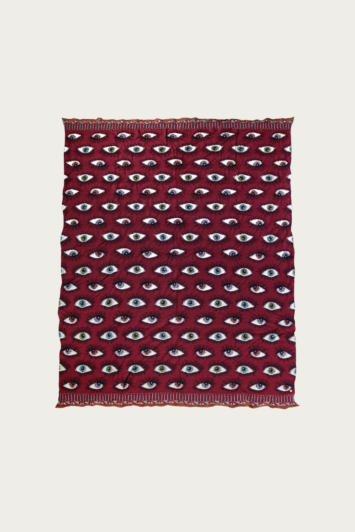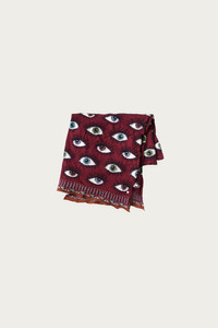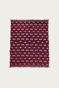 Made in the same style as our most popular and collectible scarves, these blankets are works of art that also serve as functional cold weather layers. Made from compressed wool which is extremely warm, but through Kapital's unique finishing techniques, they feel super soft and have great drape. The final product is an incredibly warm, blanket or cold weather accessory that can be styled in several ways due to its size and texture. The hardest part is picking your favorite! - Wool Blend - Cut Edges - Handwoven Designs - Every Piece is Unique - Made in Japan - Eye Motif - Wine