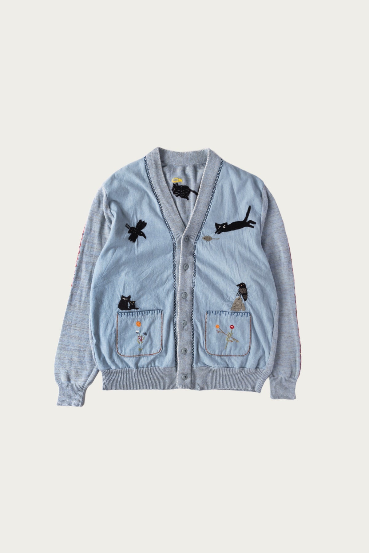 This unique cardigan combines soft knit fabric with chambray panels, adorned with intricate raven and cat embroidery. The relaxed fit and button-front design make it a versatile layering piece. - Cotton knit with chambray panels - Raven and cat embroidery - Button-front closure - Relaxed fit - Made in Japan - Sax