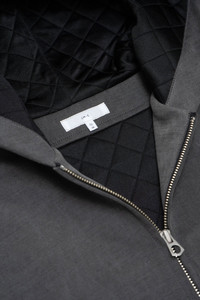 A hooded variation of the Barrington silhouette in a rich Black Mushroom shade. The fabric has a velvety, brushed surface that reads elevated without feeling precious. An insulated interior and ribbed hem give it a subtle varsity feel. - Quilted interior for warmth - Full zip closure - Welt front pockets - Rib knit hem and cuffs - Structured hood - Made in USA - Grindle Wash