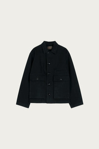 This unisex jacket is a staple of LEMAIRE's wardrobe. It is made in heavy black denim, a classic LEMAIRE fabric with a visible twill weave and a deep black wash. This unlined silhouette is boxy and slightly cropped, with a square hem and a pleated back for ease of movement. Some of its workwear inspired details include layered gusseted and hand-warming pockets, flat felled seams and adjustable cuffs. - Loose fit - Corozo Buttons - French placket - Welt front pocket - Made in Morocco - Black