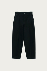 These oversized barrel-cut pants reflect Lemaire's love for workwear and reinterpretation of archetypal pieces. They are crafted in thick denim, a signature material of the house, in a deep black wash. - Oversized cut - Belt loops at the waistband - Button closure with hidden zipper - Silver-plated metal buttons - Distinct front and black pleats - Italian side pockets - Ticket pocket - Back patch pockets - Copper-toned metal rivets - Lemaire embossed leather jacron at the back - Contrast topstitching - Made in Morocco