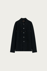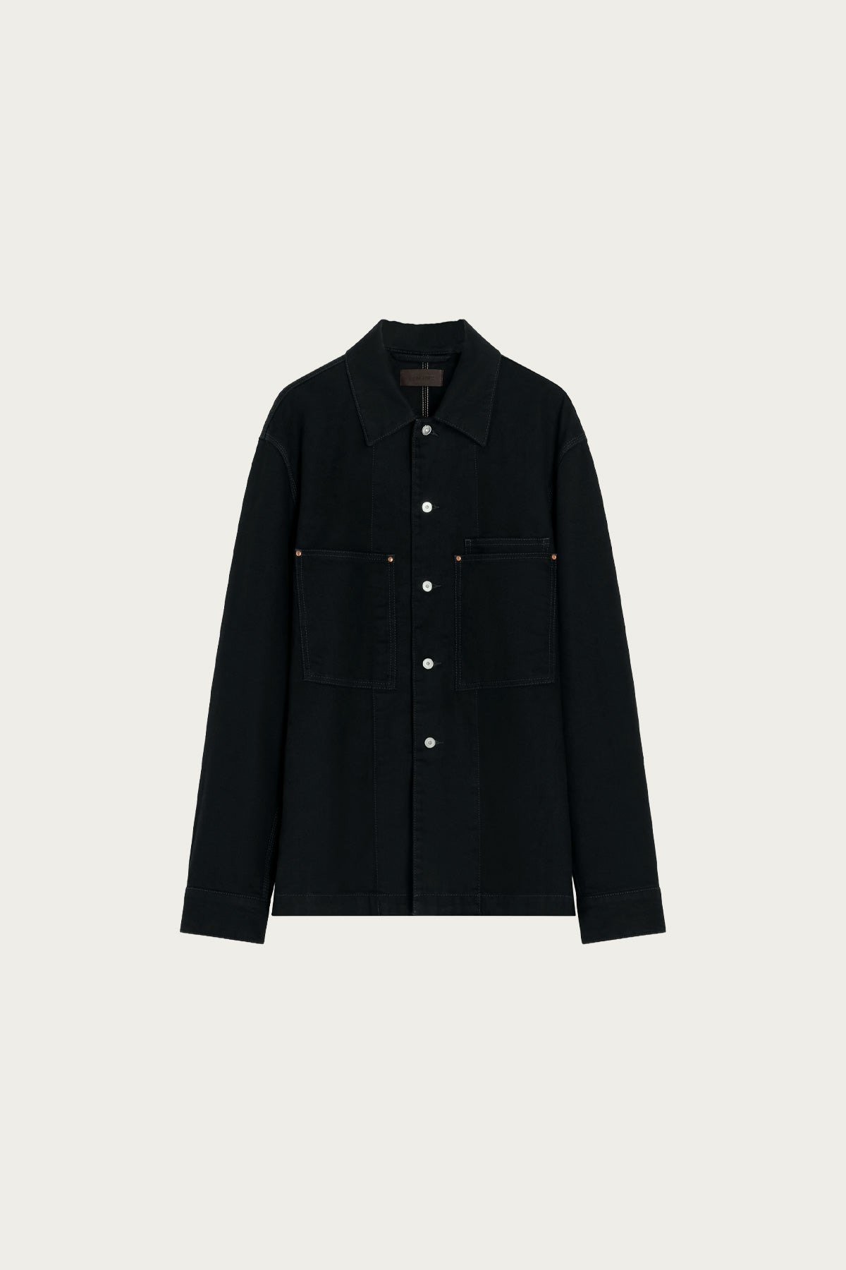 This overshirt reflects Lemaire's love for workwear and reinterpretation of archetypal pieces. It is crafted from Lemaire's signature medium-weight denim in a deep black wash. - Straight cut - Shirt collar - Front button closure - Long sleeves - Straight buttoned cuffs - Ornamental metal buttons - Chest patch pockets, including a double one - Copper rivets - Contrast topstitching - Lemaire embossed leather interior label - Black