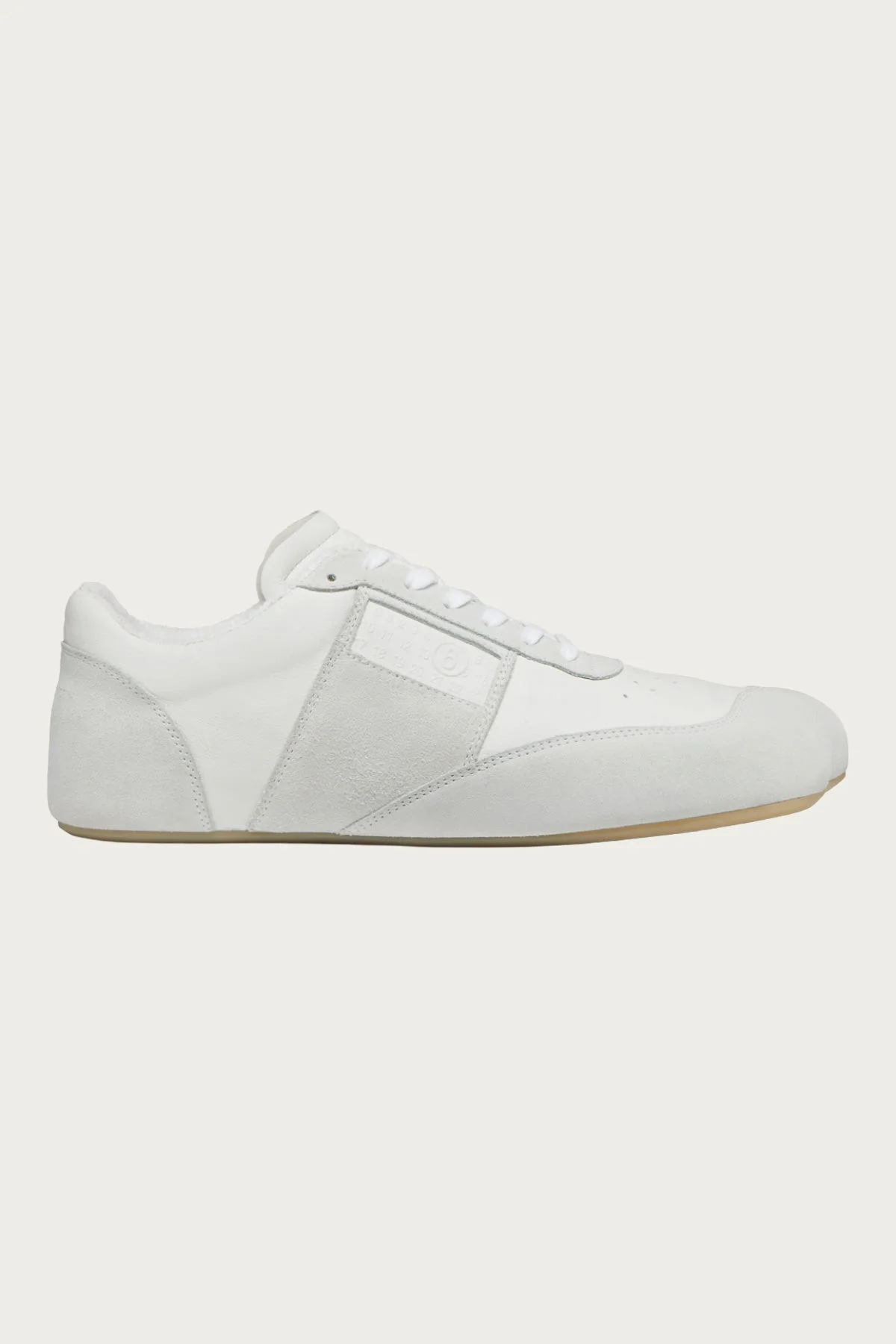 MM6 offers a clean and sculptural take on a classic training shoe with the Anatomic Sneaker. The silhouette is shaped to follow the natural form of the foot, which gives it a smooth profile and an easy feel when worn. Full leather construction keeps things sleek, while suede overlays add soft texture and subtle contrast. A tonal MM6 numerical logo sits at the side for a quiet hit of branding. The gum sole ties it all together with a familiar vintage touch. - Full grain leather upper - Suede paneling at toe, sides, and heel - Tonal MM6 numeric patch - Lightweight cushioned midsole - Gum rubber outsole - Lace up closure