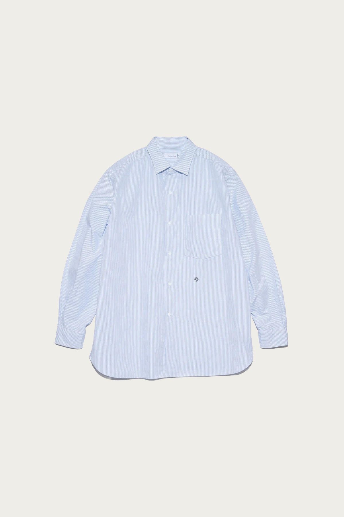 Introducing the Regular Collar Stripe Wind Shirt in Sax. Made with nanamica's original hybrid material, featuring a triple layer structure with polyester core yarn and organic cotton. Lightweight, durable, and fast-drying, this shirt boasts a relaxed silhouette with roomy cuts around the waist and collar. Stay comfortable and stylish with the embroidered nanamica logo and shell buttons. - Polyester Cotton Core Yarn Stripe/ (40% POLYESTER, 60% COTTON) - Relaxed, easy-to-move-in silhouette. - Left chest pocket. - Shell buttons. - Front embroidered with the nanamica logo. - Sax Stripe