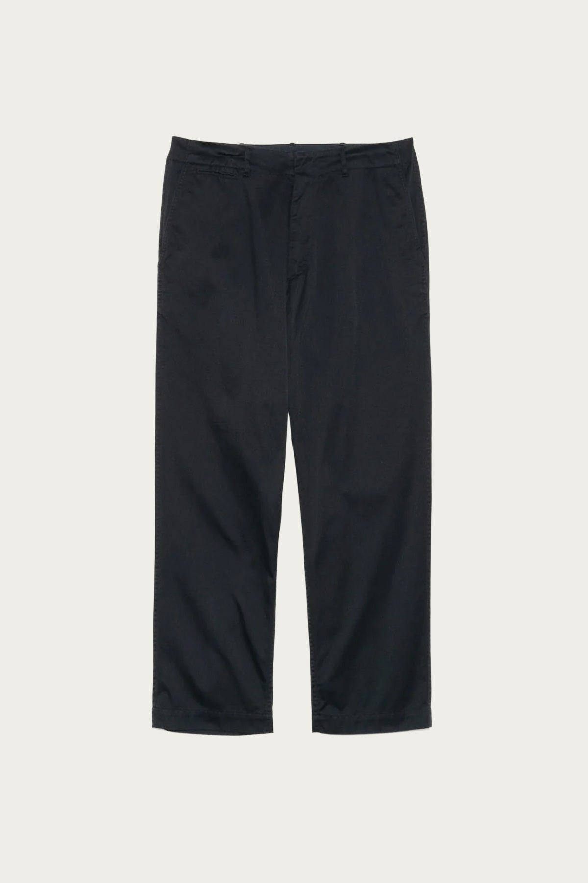 Chinos that blend timeless military shape with technical fabric for everyday comfort. The silhouette is wide with a soft taper, drawn from 1940s US Army trousers, and the fabric is a hybrid chino weave of recycled polyester wrapped in organic cotton for quick drying and durability. Practical features like the front zipper, concealed snap buttons at the back pockets, and a gusseted inseam make them ready for daily wear. - Wide tapered silhouette inspired by 1940s US Army trousers - Hybrid chino fabric made from recycled polyester wrapped in organic cotton - Front zipper opening - Concealed snap-button back pockets - Gusseted inseam - Black
