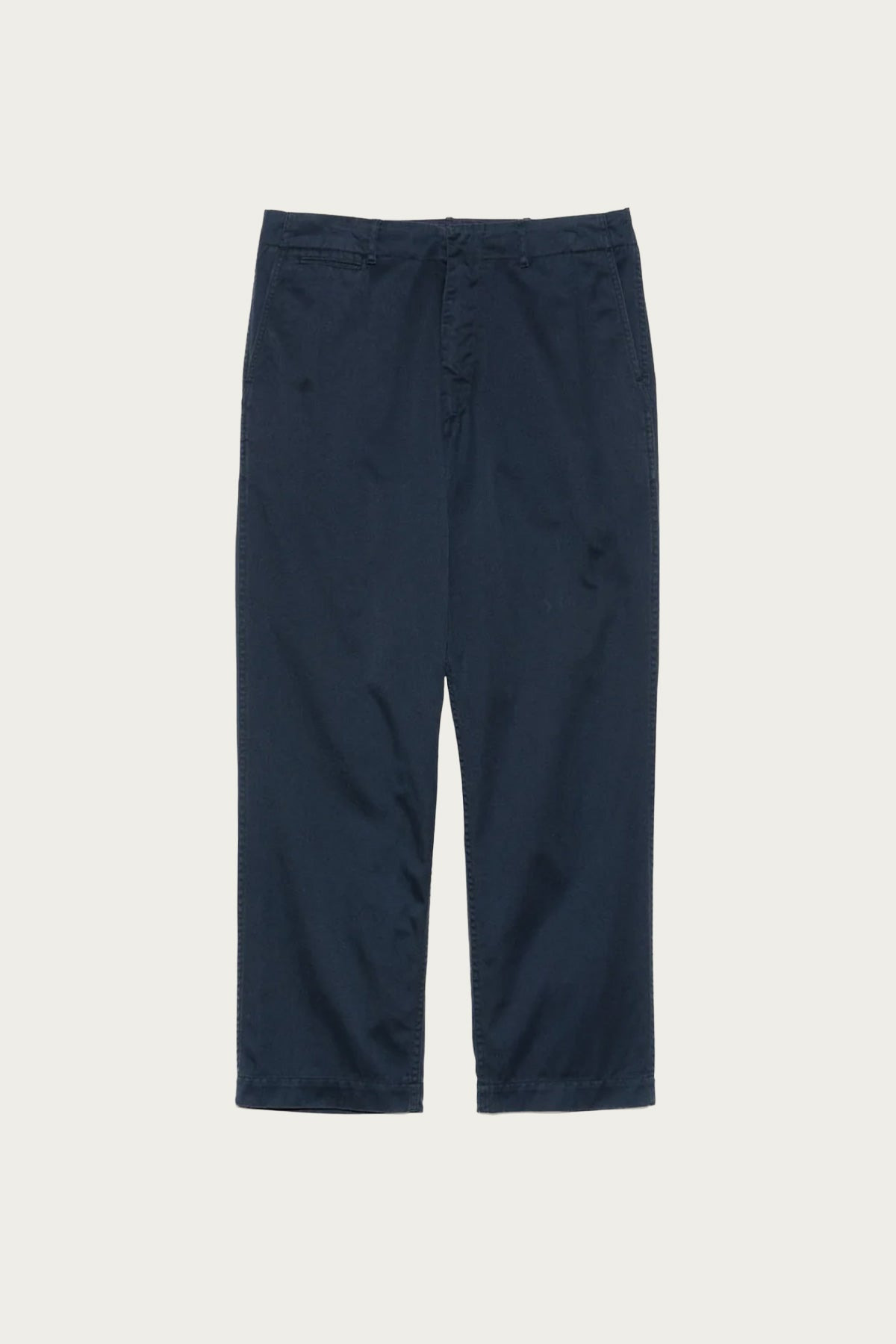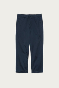 Chinos that blend timeless military shape with technical fabric for everyday comfort. The silhouette is wide with a soft taper, drawn from 1940s US Army trousers, and the fabric is a hybrid chino weave of recycled polyester wrapped in organic cotton for quick drying and durability. Practical features like the front zipper, concealed snap buttons at the back pockets, and a gusseted inseam make them ready for daily wear. - Wide tapered silhouette inspired by 1940s US Army trousers - Hybrid chino fabric made from recycled polyester wrapped in organic cotton - Front zipper opening - Concealed snap-button back pockets - Gusseted inseam for easy movement - Navy