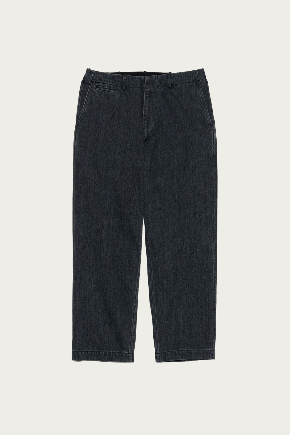 A pair of jeans with the comfort of broken-in favorites and the durability to stay in your rotation for years. The cut is wide with a gentle taper, modeled after 1940s US Army chinos, giving them a relaxed but purposeful shape. Made from rope-dyed denim where recycled polyester is wrapped in cotton, they balance softness with quick drying durability. A gusseted inseam adds mobility and small details like the concealed snap-button back pockets and zipper front make them practical for daily wear. - Wide tapered silhouette inspired by 1940s US Army trousers - Rope-dyed hybrid denim made from recycled polyester wrapped in cotton - Front zipper opening - Back pockets with concealed snap buttons - Gusseted inseam for added mobility - Grey
