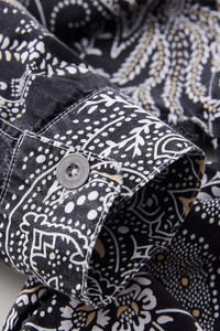 The Gyan Bandana Trucker Jacket in Black reimagines classic Western style through a modern, textured lens. Made from a custom-woven bandana jacquard fabric, this jacket combines vintage Americana with contemporary craft. The black colorway brings depth and versatility, allowing the intricate pattern to stand out with subtlety. With Western-style yoke detailing, contrast stitching, and polished metal hardware, it’s a nod to tradition with a fresh twist. The boxy fit and sturdy construction give it a timeless, relaxed shape that’s as wearable as it is bold. Perfect for layering or standing on its own, this jacket bridges heritage design with today’s elevated sensibility. - Made in Japan - Fits true to size with a relaxed, boxy fit - Black