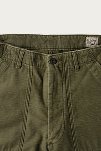 A faithful nod to vintage military uniforms, the Vintage Fit Fatigues are made with the kind of care and consideration that feels rare these days. Cut from a rugged yet softly brushed cotton, they come with that broken-in comfort right out of the gate — the kind of pants that feel like old favorites from day one. The fit is relaxed through the leg, giving them an easy shape that wears well with just about anything. Finished with time-honored details like patch pockets, a button fly, and adjustable side tabs at the waist. The dark olive tone is rich, wearable, and timeless — a true everyday staple. - 100% cotton - Adjustable button-tab waist - Button fly - Made in Japan - Washed Dark Olive