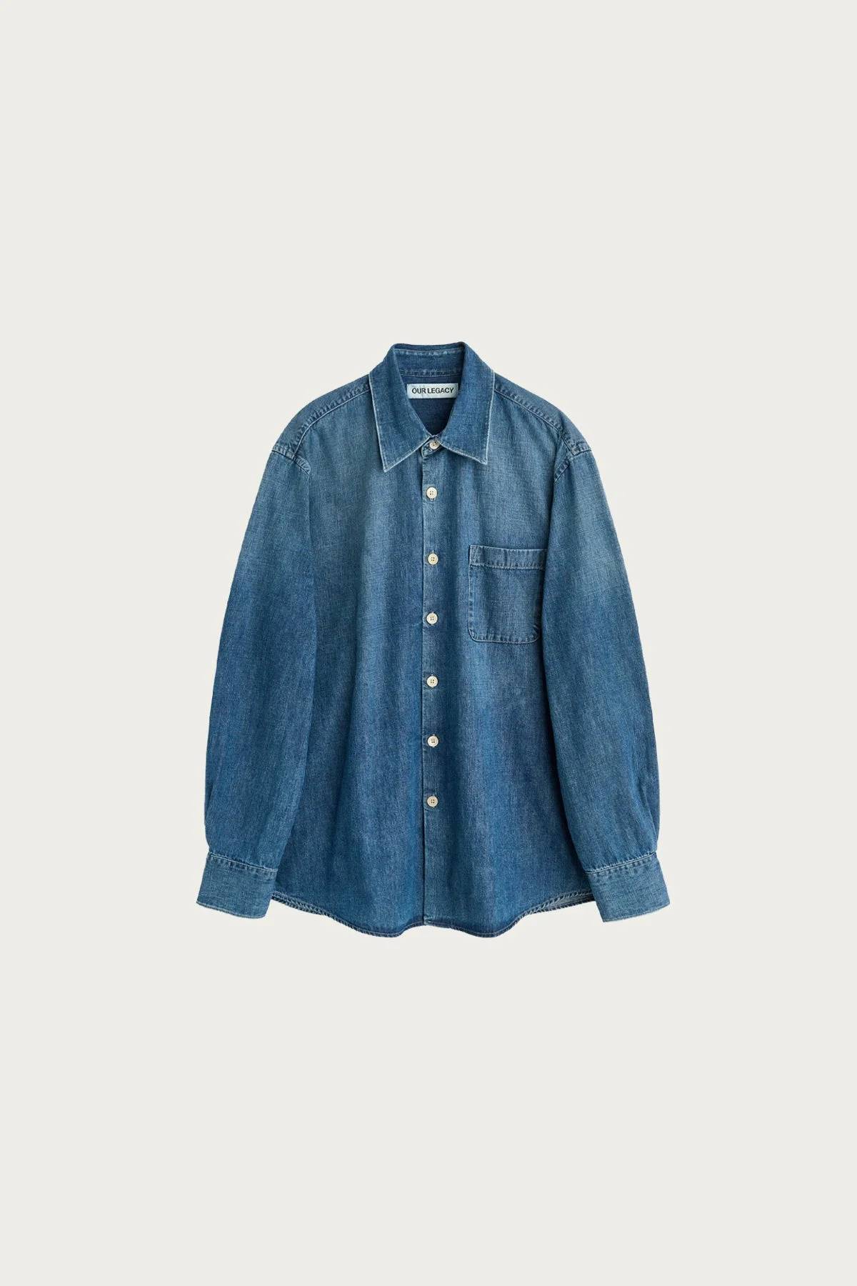 Our Above Shirt in Whatever Wash. Produced in an Italian organic cotton fabric with a vintage denim wash, the men's Above Shirt has a slightly oversized cut and features a single chest pocket, mother of pearl buttons, a curved hem and mitered cuffs. This garment is manufactured using carefully sourced material with a unique treatment process that will give each garment an individual shade and appearance. This technique could result in some color bleed onto lighter garments or surfaces. The garment shall be shaped by its wearer and naturally distress over time to finish the design process.