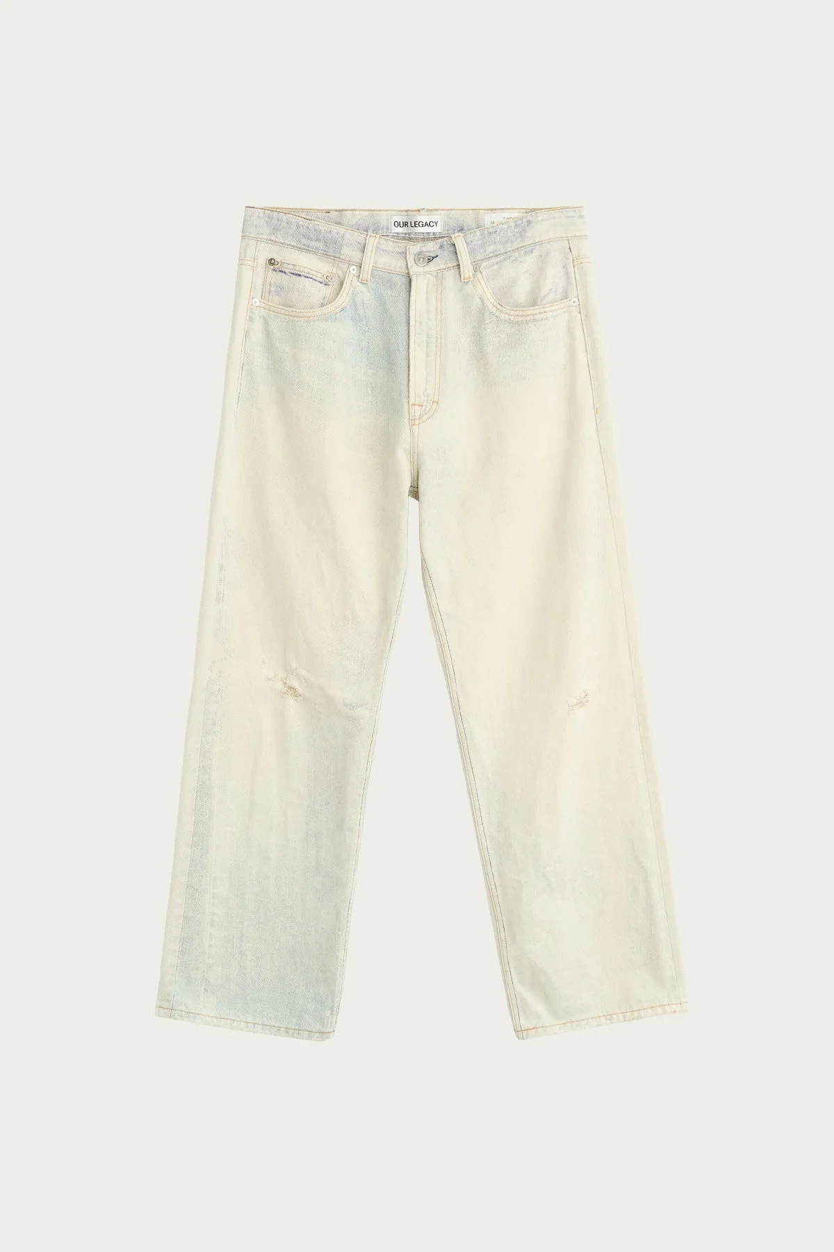 Our Legacy’s Third Cut is a relaxed straight jean with a slightly wider leg and classic five pocket construction. This version features the Digital Coffee print, creating a washed, abstract pattern that blends shades of faded denim and earthy tones. The cut sits comfortably through the rise with a straight, easy leg that works well with both casual and more styled outfits. Subtle distressing and print variation give each pair a worn, lived in character. Pair them with simple tees or knitwear to let the print stand out. They also look great with oversized shirts and relaxed jackets.