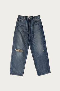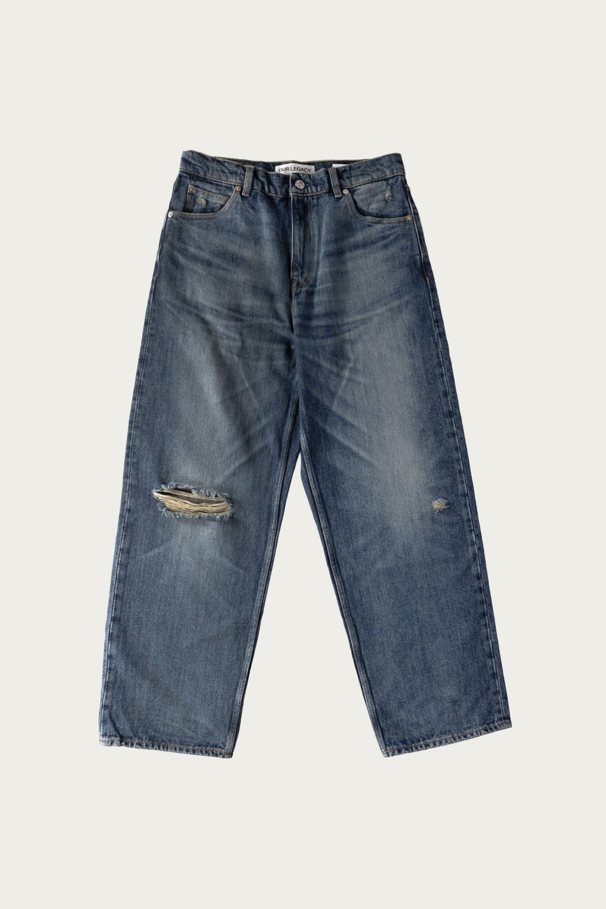 Our Vast Cut in Road Worn Rope Twill. Produced in Italian cotton hemp fabric, the men's Vast Cut has a wide loose fit with high waist and features indigo dyeing, hand-distressed fading, YKK zip fly, steel rivets, five pockets and an embossed OUR LEGACY patch. The high-thickness hemp-cotton blend brings together exceptional durability, breathability, and sustainability. Hemp, one of nature's strongest fibers, ensures lasting performance while providing excellent air circulation for comfort. The fade and distressing have been meticulously crafted by hand, with artisanal techniques that create a natural, uneven movement resulting in a one-of-a-kind appearance. - Italian fabric - 64% Cotton 36% Hemp - Indigo dyed - Distressed by hand - Each pair has a unique fade - Wide loose cut - High waist - Five pockets - Steel rivets - Embossed OUR LEGACY patch