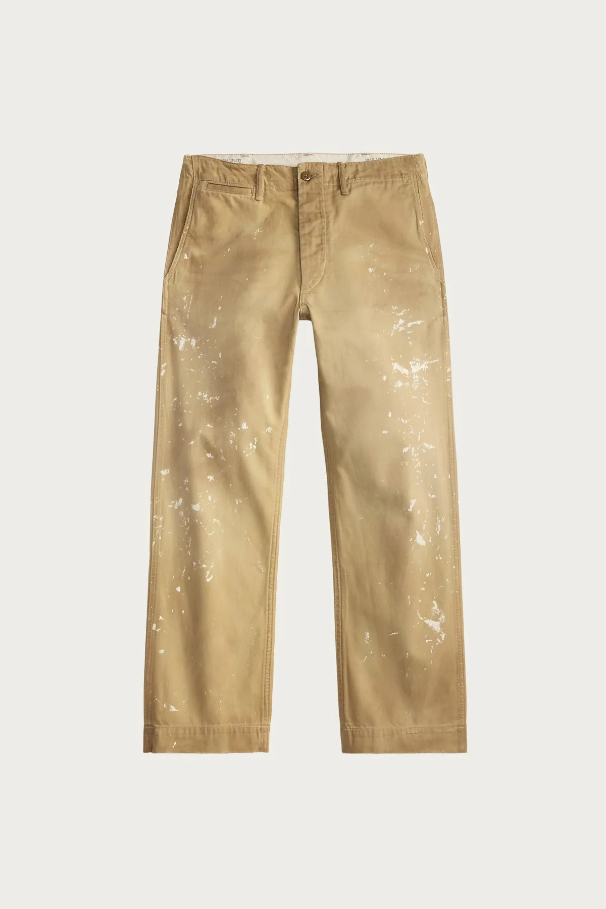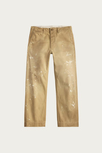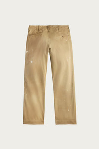 Classic field pants made from sturdy cotton twill and finished with hand applied distressing. The paint splatter and fading give each pair a workshop worn look that feels authentic rather than forced. - Classic-fitting pants made with cotton twill from Japan. - Inspired by field pants from the 1940s. - Heavily abraded with paint splatter and pigment throughout for a worn-in look.