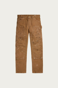 Straight-fitting carpenter pants made with cotton canvas fabric that was woven in the USA. Vintage workwear–inspired details. Button-fly construction. Hand-distressed with pigment and paint splatters for an authentic timeworn look. Sanforized® to minimize shrinkage. - Engineer Fit: regular fit with a medium rise and a straight leg. - Belt loops. Button fly with a signature buttoned closure. American-made metal buttons. - Five-pocket styling. Right leg tool pockets. Left leg hammer loop. - Reinforced at the knees. - 100% cotton.