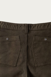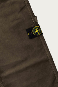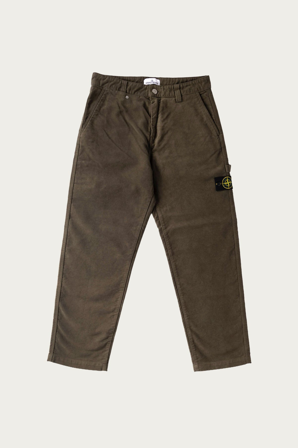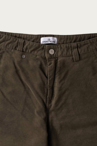 The Cotton Moleskin Trousers from Stone Island rework a military-inspired shape through dense, garment-dyed moleskin. The fabric has a soft hand but a tough build, giving it structure and long wear. The loose fit adds movement and volume, while the pocket design nods to classic utility: slanted hand pockets, a small snap pocket at the waist, patch pockets at the back, and a vertical snap pocket on the leg. Finished with the Stone Island badge on the left thigh, these trousers balance function, texture, and clean construction in a way that feels naturally broken in from the start. - 100% cotton moleskin, - Slanted hand pockets - Back patch pockets with angled entry and snap closure - Stone Island badge on leg