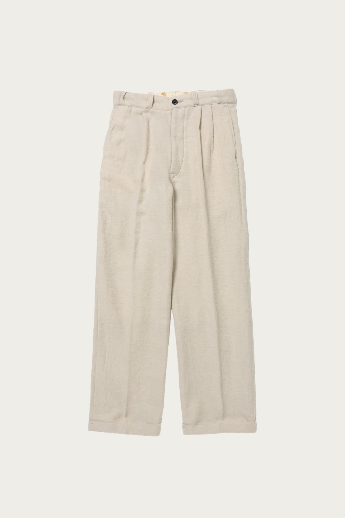 The Lot.201 Work Trousers are rooted in the straightforward lines of 1940s American workwear, reimagined with Taiga Takahashi’s devotion to material craft. The silhouette is low-rise and marked by clean vertical lines that fall straight from the thigh, giving them a practical yet refined presence. Buttons sewn into the inside of the waistband nod to the era’s reliance on suspenders, keeping the look authentic while adding a styling option. The fabric itself is a thoughtful blend of wool and linen finished with an intense wash that brings out natural irregularity and depth. Each button is carved from genuine water buffalo horn, a material prized for its strength and unique surface patterning, giving every pair small variations that can’t be replicated. The trousers are at once functional, durable, and quietly elevated.