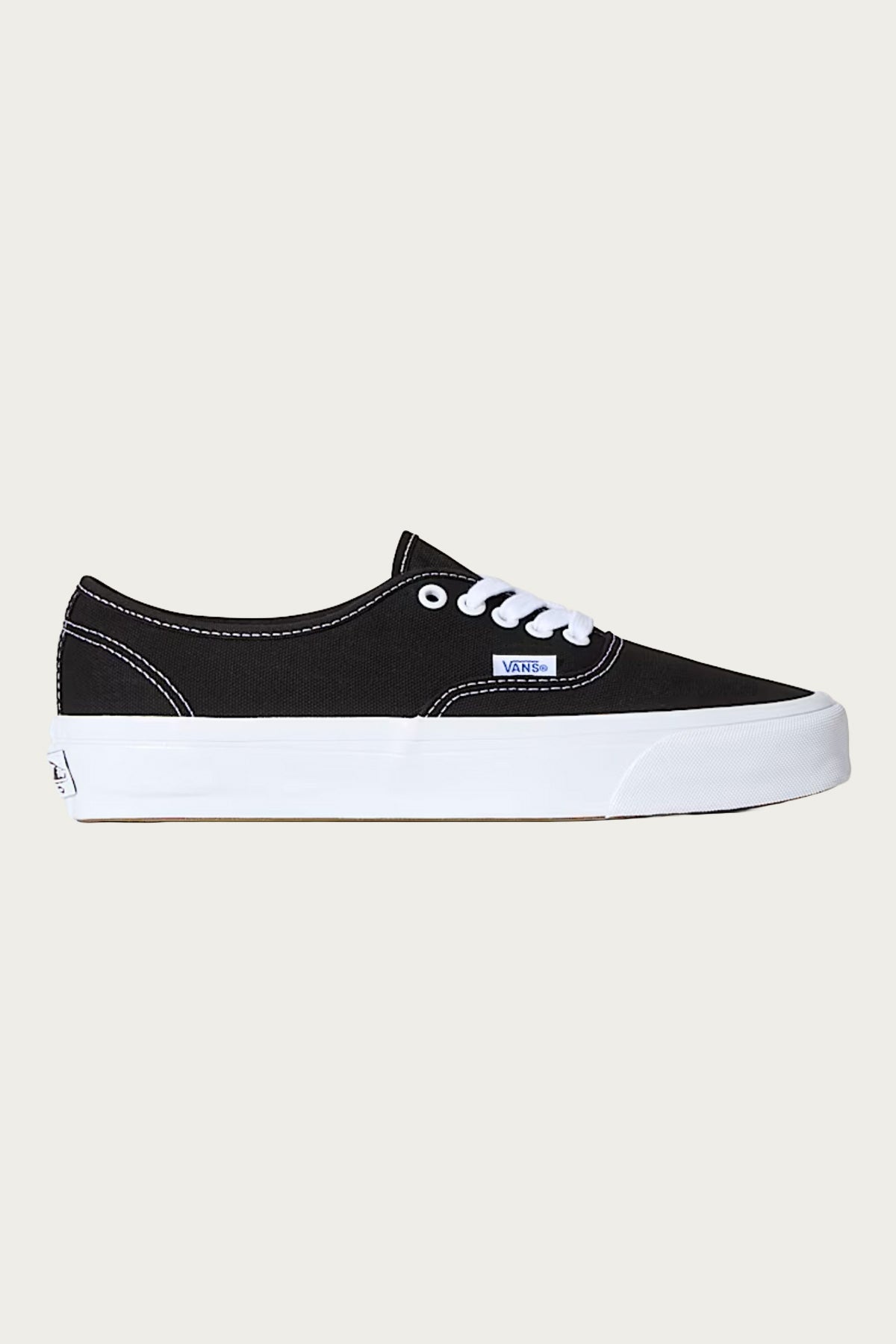 The blueprint in its purest form. The LX Authentic Reissue 44 in Black & White strips everything back to basics — no print, no pop colors, just clean lines and classic proportions in a warm, natural shade that feels timeless. It’s that old canvas sail kind of tone-- lived-in, sun-kissed, and ready for whatever you’re getting into. With Vault’s upgraded materials and detailing, this version takes the original deck shoe and dials it in: heavier canvas, higher foxing, and that tried-and-true waffle outsole. Tonal laces and metal eyelets keep the look crisp but never clinical. Style it with literally anything: washed indigo denim and a vintage white tee for the classics, or go tonal with linen trousers and an open-collar shirt for a modern minimal vibe. Pair with fatigues, pleats, or painter pants-- it’s a palette cleanser that never gets old. Fits true to size. Sizing is in US Men's. - Premium off-white canvas upper - Vans Vault LX upgraded construction - Authentic Reissue 44 silhouette with metal eyelets - Vulcanized rubber waffle outsole - Timeless, neutral tone with all-season versatility