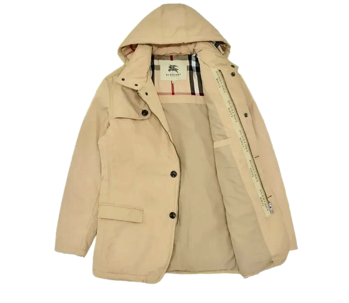 beige Burberry jacket featuring a detachable hooded design and the signature check pattern lining.