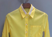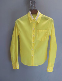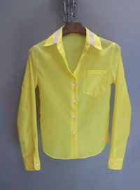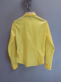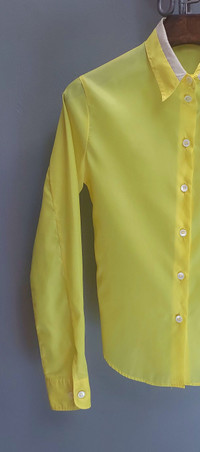 Tag size: 38 Bright Yellow Sheer Shirt with Contrast Collar Please note: has a small pinhole, minor scratches, and light stains (as shown in photos) PLEASE CHECK MEASUREMENTS BEFORE PURCHASING. "TAG SIZE MAY NOT REFLECT TRUE FIT." DISCLAIMER: Product colour may slightly vary due to photographic lighting Will be shipped semi-ironed Dimension Shoulders: 15" Bust/Pit to pit: 17" Waist: 15.5" Sleeve length: 24" Length from nape: 23.5" Hem: 16" Composition 100% nylon Ask all you want before buying Accept payments through PAYPAL/STRIPE Courier: DHL Express Location: Manila, Philippines