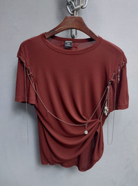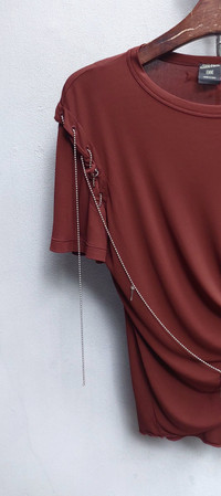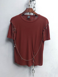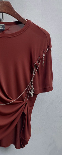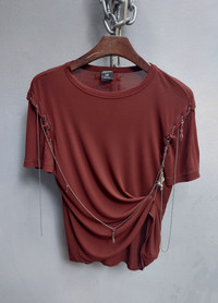 Tag size: I 44 D 40 F 40 GB 12 US 10 Jean Paul Gaultier Chain T-Shirt A standout design from Jean Paul Gaultier, this deep brick-red t-shirt transforms a classic silhouette with avant-garde detailing. Draped silver-tone chains are intricately attached through grommets and loops along the shoulders and body, creating an edgy deconstructed look. Lightweight with a fluid drape, it merges streetwear energy with Gaultier’s unmistakable couture-inspired PLEASE CHECK MEASUREMENTS BEFORE PURCHASING. "TAG SIZE MAY NOT REFLECT TRUE FIT." DISCLAIMER: Product colour may slightly vary due to photographic lighting Dimension Shoulders: 18" Bust/Pit to pit: 18" Waist: 17" Sleeve length: 7" Length from nape: 22.5" Hem: Composition 100% rayon Made in Italy Ask all you want before buying Accept payments through PAYPAL/STRIPE Courier: DHL Express Location: Manila, Philippines