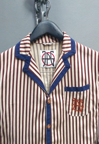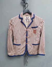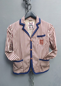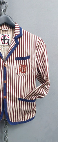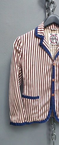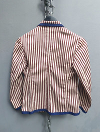 Tag size: S Vintage Jean Paul Gaultier unlined blazer featuring bold vertical stripes in burgundy and ivory. Detailed with contrast navy piping on the collar, lapels, cuffs, and pockets for a sharp tailored look. Designed with front button closure, three functional pockets, and the JPG embroidered logo on the chest. Lightweight and unlined for a relaxed, easy-to-wear structure. PLEASE CHECK MEASUREMENTS BEFORE PURCHASING. "TAG SIZE MAY NOT REFLECT TRUE FIT." DISCLAIMER: Product colour may slightly vary due to photographic lighting Dimension Shoulders: 15" Bust: 17" Waist: 15.5" Sleeve length: 19.5" Length from nape: 22" Composition 60% cottom 40% elastane Made in Italy Ask all you want before buying Accept payments through PAYPAL/STRIPE Courier: DHL Express Location: Manila, Philippines