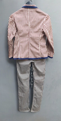 Tag size: S Striking Jean Paul Gaultier two-piece set featuring a lightweight unlined blazer and matching striped trousers. The blazer is detailed with bold burgundy and ivory vertical stripes, contrast navy piping on the collar, lapels, cuffs, and pockets, plus a chest pocket embroidered with the JPG logo. The straight-leg trousers complement with classic black and ivory stripes, designed in a mid-rise cut with a clean tailored finish. Together, the set captures Gaultier’s signature play on pattern, tailoring, and avant-garde style—perfect for collectors and statement dressing. • Vintage Jean Paul Gaultier unlined blazer featuring bold vertical stripes in burgundy and ivory. Detailed with contrast navy piping on the collar, lapels, cuffs, and pockets for a sharp tailored look. Designed with front button closure, three functional pockets, and the JPG embroidered logo on the chest. Lightweight and unlined for a relaxed, easy-to-wear structure. PLEASE CHECK MEASUREMENTS BEFORE PURCHASING. "TAG SIZE MAY NOT REFLECT TRUE FIT." DISCLAIMER: Product colour may slightly vary due to photographic lighting Dimension Shoulders: 15" Bust: 17" Waist: 15.5" Sleeve length: 19.5" Length from nape: 22" • Jean Paul Gaultier Striped Straight-Leg Pants Classic Jean Paul Gaultier striped trousers in black and ivory. Tailored in a straight-leg cut with a mid-rise waist and concealed closure for a clean silhouette. Crafted in a crisp, lightweight fabric that complements both casual and refined looks. Can be styled alone or paired with the matching blazer for a full coordinated set. Dimension Waist: 12.5" - 13" Front rise/Crotch: 10.5" Hips: 15" - 17" Thigh: 9" - 11" Knee: 7" - 8.5" Inseam: 30" Outseam: 42" Leg opening: 6.5" Composition 60% cottom 40% elastane Made in Italy Ask all you want before buying Accept payments through PAYPAL/STRIPE Courier: DHL Express Location: Manila, Philippines