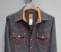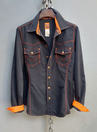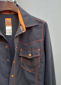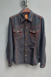 Tag size: 44 PLEASE CHECK MEASUREMENTS BEFORE PURCHASING. "TAG SIZE MAY NOT REFLECT TRUE FIT." DISCLAIMER: Product colour may slightly vary due to photographic lighting Jean Paul Gaultier Button-Up Shirt Structured long-sleeve shirt with bold orange contrast stitching and snap button closure. Features dual flap chest pockets with signature angular stitching and gold-tone buttons. Finished with sharp pointed collar and cuffs lined in vibrant orange satin for a hidden pop of color. A piece that channels Gaultier’s playful take on Western-inspired tailoring. The snap is complete, but there’s a hole on the left pocket of the top. Please check the last photo for the pocket detail (with pin). Dimension Shoulders: 16" Bust/pit: 20.5" Waist: 19" Sleeve length: 25" Length from nape: 27" Hem: 22.5" Composition 67% polynosic 33% polyester Made in France Polynosic blend – a premium rayon fabric with a silky hand feel, excellent drape, and durable structure. Ask all you want before buying Accept payments through PAYPAL/STRIPE Courier: DHL Express Location: Manila, Philippines
