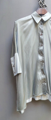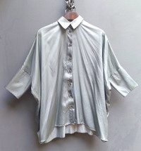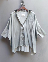 Tag size: Medium FLAWS: This blouse has some barely noticeable stains on certain areas. The stains can be seen in the last photo. Authentic Martin Margiela Line 6 oversized shirt crafted from a lightweight, fluid fabric with a soft sheen. Designed with a relaxed, boxy silhouette and dropped shoulder construction, where the extended shoulder line flows naturally into wide short sleeves. Features a classic pointed collar, full button-front closure, and a subtly curved hem that enhances its fluid drape. Minimalist and refined, the piece reflects Margiela’s signature deconstructed approach—quietly elegant, architectural, and timeless. Design Details: • Pointed collar • Button-front closure • Dropped shoulders with extended shoulder line flowing into wide sleeves • Relaxed, oversized silhouette • Fluid drape with soft sheen finish Details: • Brand: Martin Margiela • Line: Line 6 (Women’s) • Color: Soft silver / celladone • Fit: Oversized / Relaxed • Material: Silk or silk-blend (based on texture and drape) • Style: Avant-Garde / Minimalist / Deconstructed • Condition: Pre-owned, good condition Dimension Shoulders (approx): 18" Bust/Chest: 35" Waist: 35" Sleeve length (+ e×tended shl): 15" Length from nape: 28" Hem: 35" Composition 55% cupro 45% modal Made in Italy Please note that all sales are final. We do not accept returns, refunds, or exchanges. Ask all you want before buying Accept payments through PAYPAL/STRIPE Shipping via DHL Express only for fast, secure delivery with full tracking. Rates reflect DHL’s premium international service. Location: Manila, Philippines