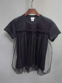 Tag size: S PLEASE CHECK MEASUREMENTS BEFORE PURCHASING. "TAG SIZE MAY NOT REFLECT TRUE FIT." DISCLAIMER: Product colour may slightly vary due to photographic lighting Will be shipped semi-ironed Noir Kei Ninomiya black short-sleeve top featuring a cotton jersey base with sheer gathered tulle overlay. Crewneck design with layered silhouette, blending casual wear and avant-garde detailing. Dimension Shoulders: 14" Bust: 18" Waist: 18" Sleeve length: 6" Length from nape: 22.5" Hem: 18" Composition Main: 100% cotton Attached fabric: 100% nylon Made in Japan Ask all you want before buying Accept payments through PAYPAL/STRIPE Courier: DHL Express Location: Manila, Philippines