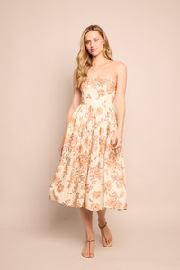• Strapless midi dress with bubble skirt • Designed for fit and flare look • Garment features a structured bodice with boning at side-seams and front princess seams • Back bodice has an elastic smocked panel for easy fit • Interior neckline has silicone tape for better grip • Bubble hem construction at skirt • Side seam zipper opening with hook-and-eye closure • Functional side-seam pocket bags • Garment is fully lined in cotton voile • Placed print Details • 100% Linen, 100% Cotton Lining • Dry Clean Only or Hand Wash Cold • Made in China