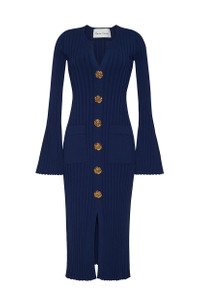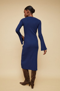 • Midi, long flared sleeve sheath dress with non-functional gold flower shank buttons • Crewneck • Slim fitted • Patch pockets at side front • Slits at sleeve hem • Rib knit • Slick knit This garment is special and might stretch over time if hung. To preserve its shape, we recommend taking extra care and folding. Details • 83% Viscose 17% Poly • Dry Clean Only or Hand Wash Cold • Made in China