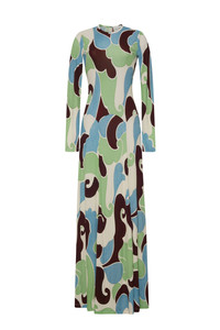 • Longsleeve maxi dropwaist dress with shaped waist seam • Princess seams on front and back skirt • Center back invisible zipper with hook-and-eye at top opening • Crew neckline • Top stitching detail at sleeve opening and hem opening • Curved waist seam across skirt • Unlined • Allover print Details • 93% Viscose 7% Spandex • Dry Clean Only or Hand Wash Cold • Made in China
