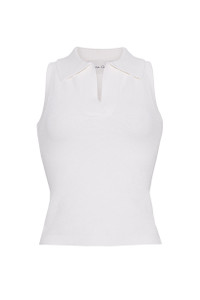 • Collared sleeveless fit and flare fitted top • Racerback • Slick knit • Novelty pique Details • 83% Viscose 17% Poly + Spandex • Dry Clean Only or Hand Wash Cold • Made in China