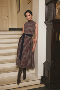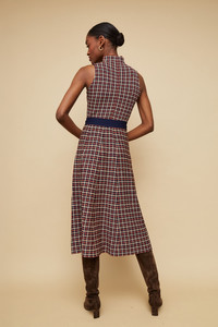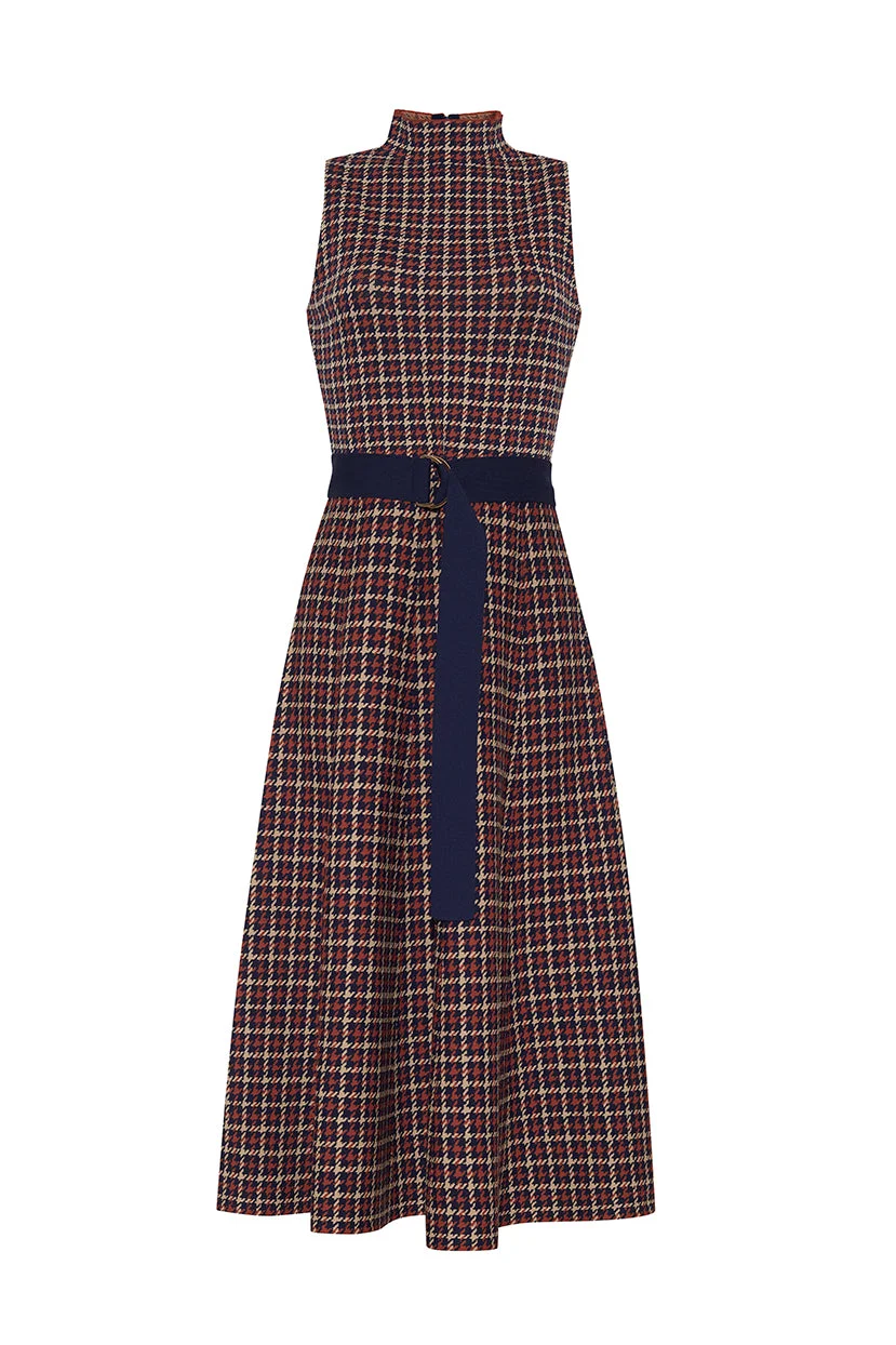 • Funnel-neck sleeveless flared midi dress with fashioned plaid knit jacquard • Center back invisible zip • Detachable gold D-ring belt sash Details • 63% Viscose 37% Nylon • Dry Clean Only or Hand Wash Cold • Made in China