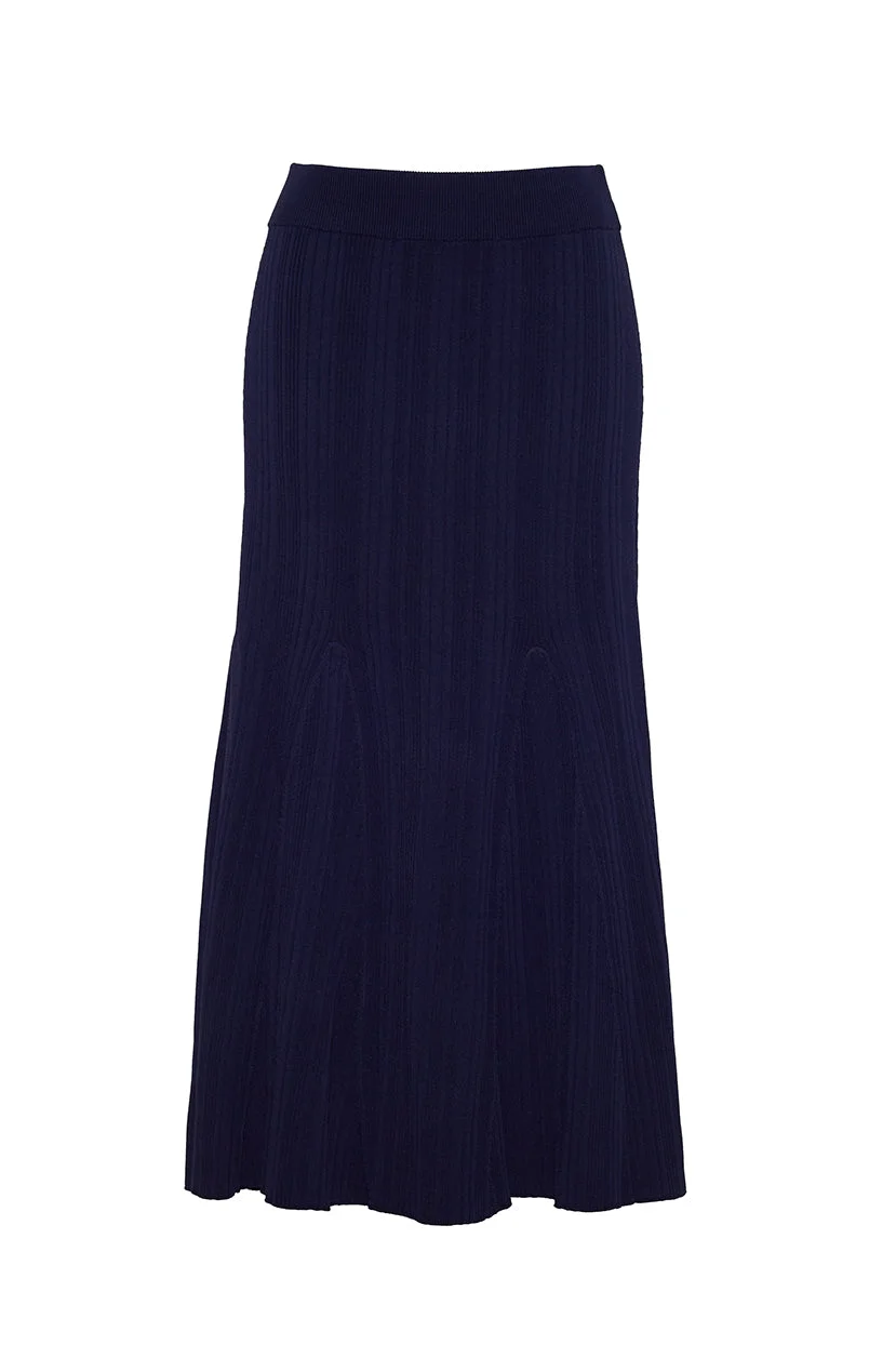 • Elastic waist midi length variegated rib knit trumpet skirt • Fitted and godets at the bottom Details • 72% Viscose 27% Nylon 1% Spandex • Dry Clean Only or Hand Wash Cold • Made in China
