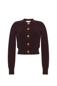 • Crewneck fitted long-sleeve cardigan with novelty gold floral buttons This garment is special and might stretch over time if hung. To preserve its shape, we recommend taking extra care and folding. Details • 70% Wool 30% Cashmere • Dry Clean Only or Hand Wash Cold • Made in China