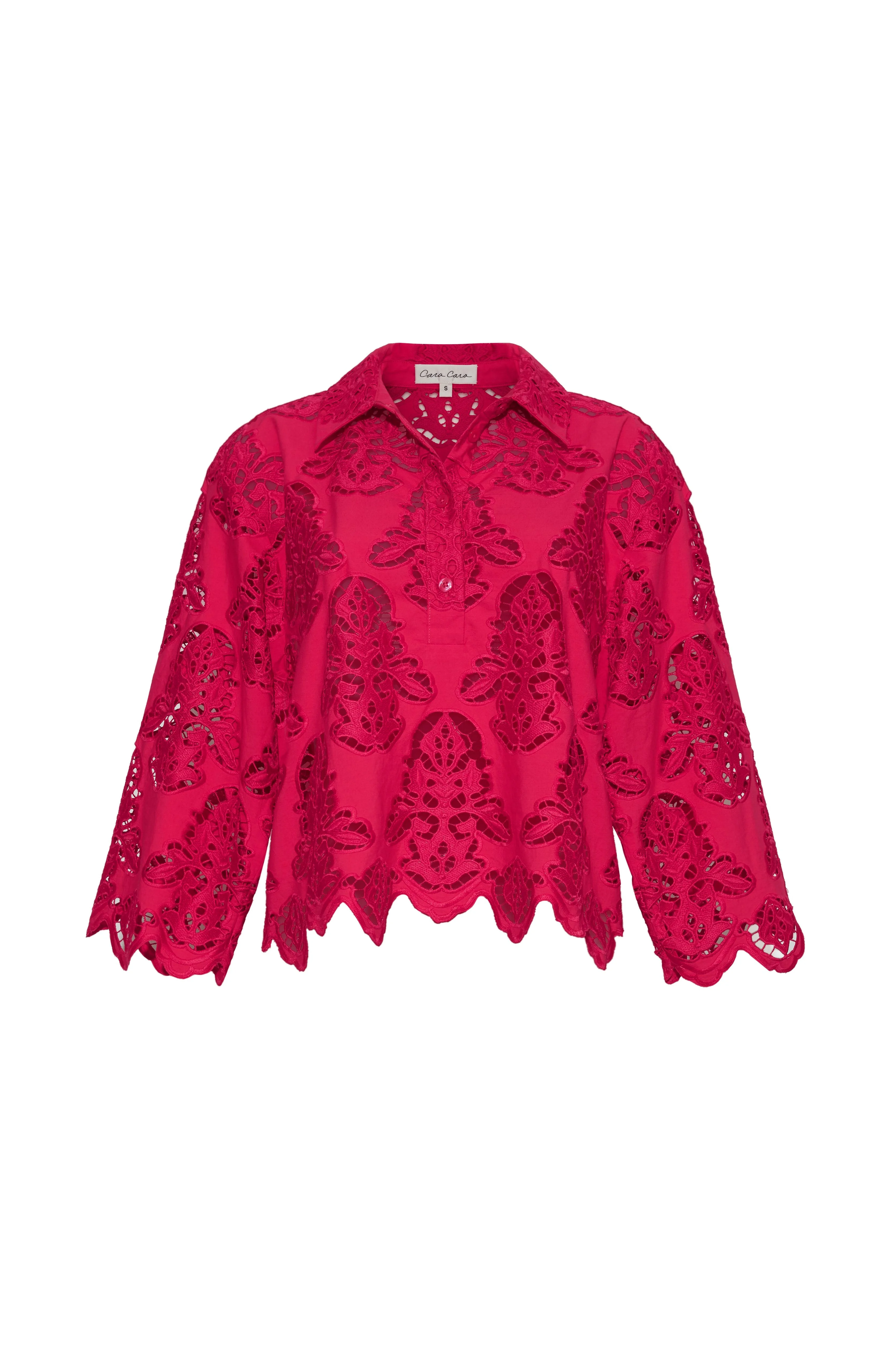 • Half placket at center front • Kimono sleeve hem with scallop edge • Boxy fit • Slightly cropped • Body and sleeve hem feature decorative scallop detail • Unlined • Placed eyelet Details • 100% Cotton • Dry Clean Only or Hand Wash Cold • Made in China
